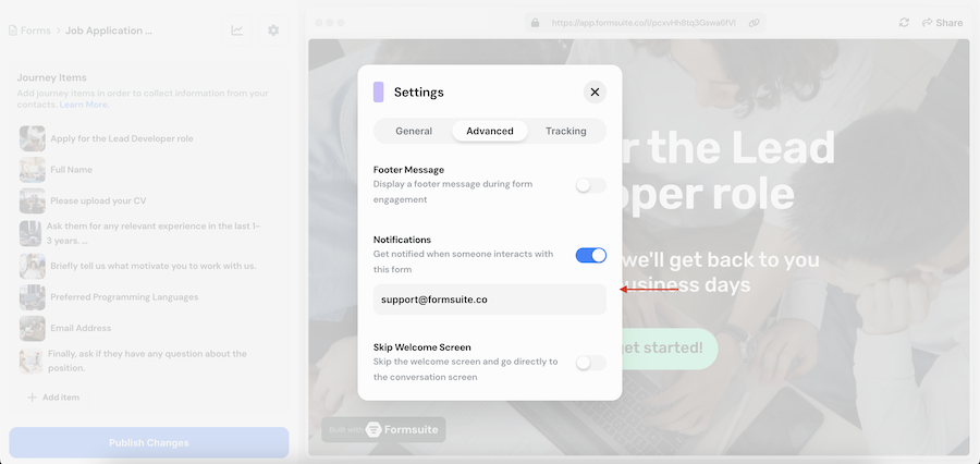 You change this email to whatever you like to start receiving email notifications when someone engages with your form. Alternatively, you can toggle the notification settings off and stop receiving any email notifications regarding this form.
