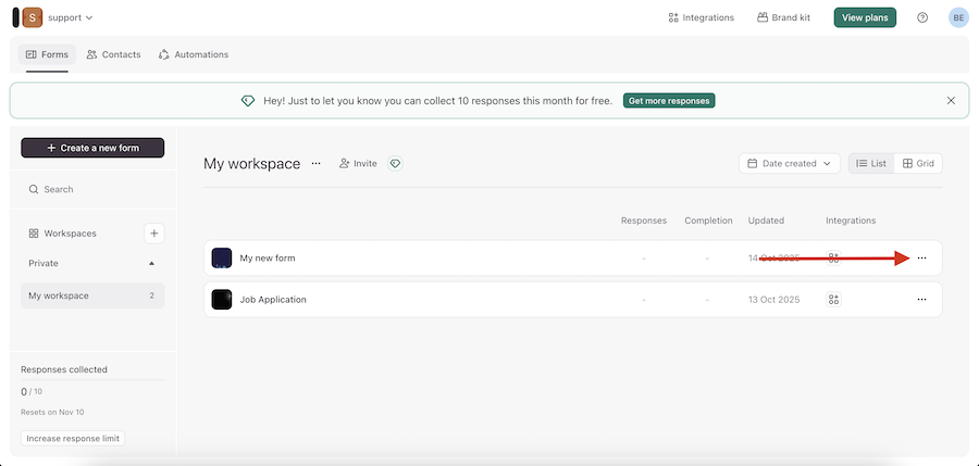 Open your Typeform dashboard and find the form you'd like to bring into Formsuite. Click the three-dot menu next to the form and choose "Copy Link".