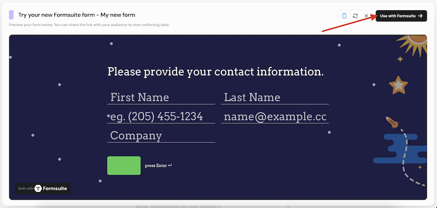 Once you're finished testing out your new form. Click on “Use with Formsuite” and add it directly to your workspace. If you've not signed up yet, you'll be asked to sign up before your new form is added to your workspace.