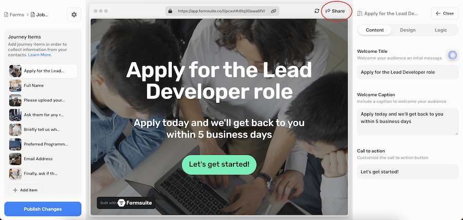 The easiest way to share your form is by clicking on “Share” from the editor. Simply open up the editor, and then in the top right corner of the browser preview, you'll see a button labelled “Share”. This will open a modal with some different share options.