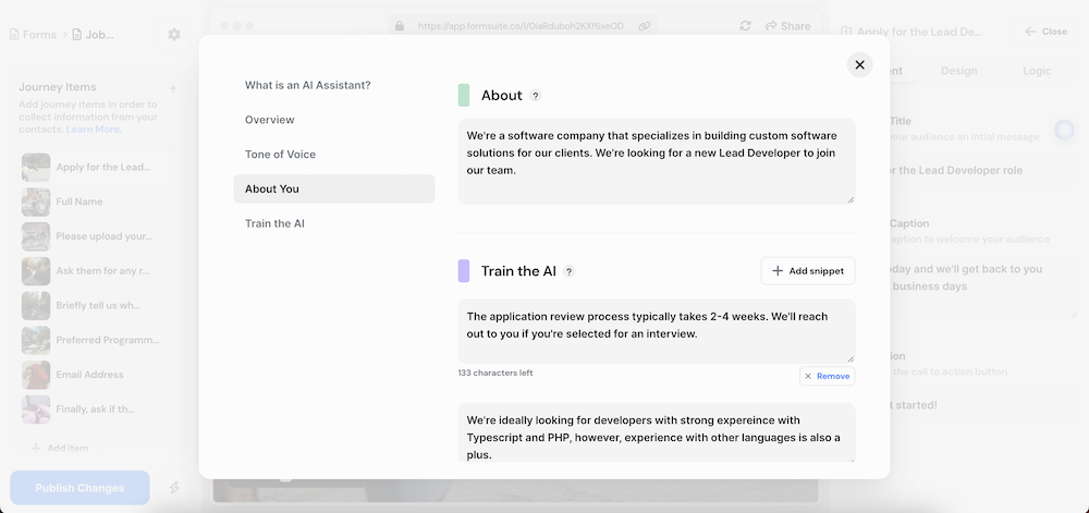Each forms comes with it's own AI assistant. This assistant can easily be trained on your specific data to help with your form building experience and make your user's data more easily digestible.