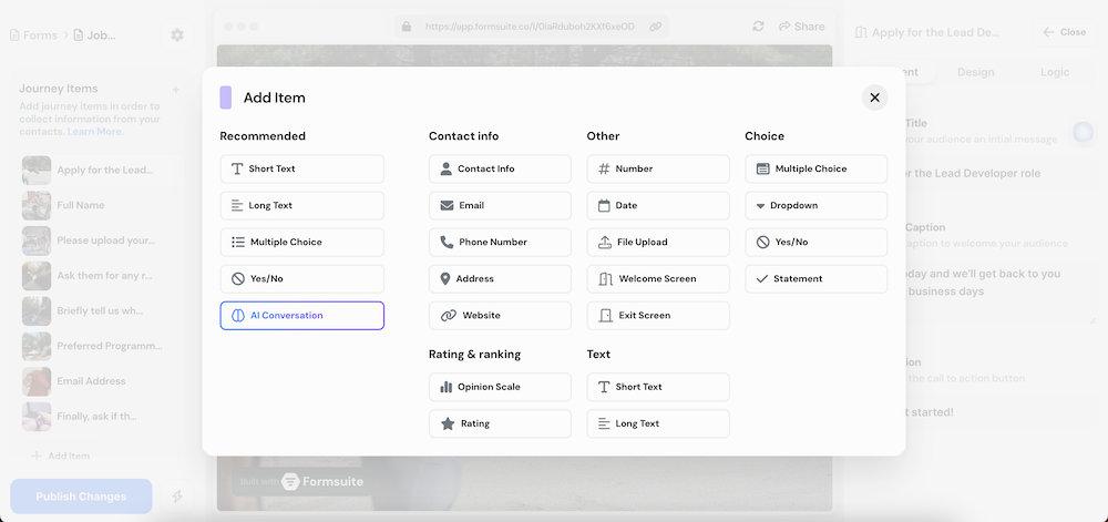 Forms that flow like a natural conversation, expand using the AI Conversation block for intelligent follow-ups and real-time responses.