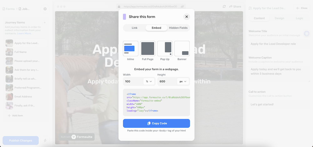 Seamlessly integrate Formsuite across your digital landscape. With flexible sharing options—link, iframe, dedicated webpage, chat popup, or banner popup—ensure consistent lead capture and engagement on any platform.